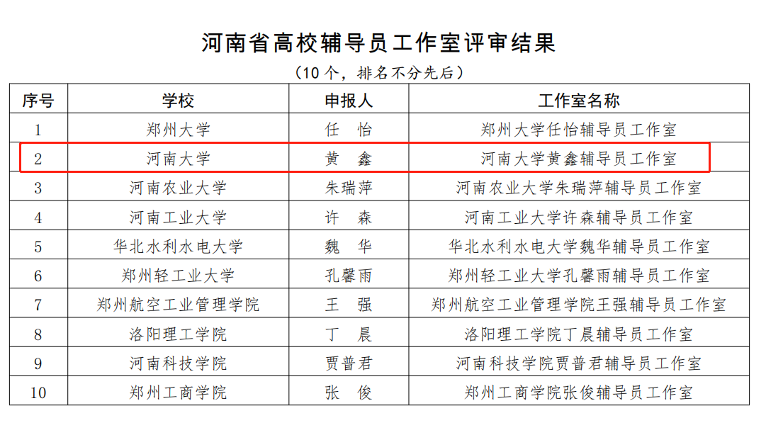 近日,河南省委教育工委、河南省教育厅公布《关于河南省高校辅导员工作室评审结果的公示》,ac米兰党委学生工作部组织申报的“ac米兰官网中文网站黄鑫辅导员工作室”榜上有名。此次评选活动自今年7月启动,经各高校申报、资格审查、专家评审、综合评议等环节,评选出10个河南省高校辅导员工作室。
