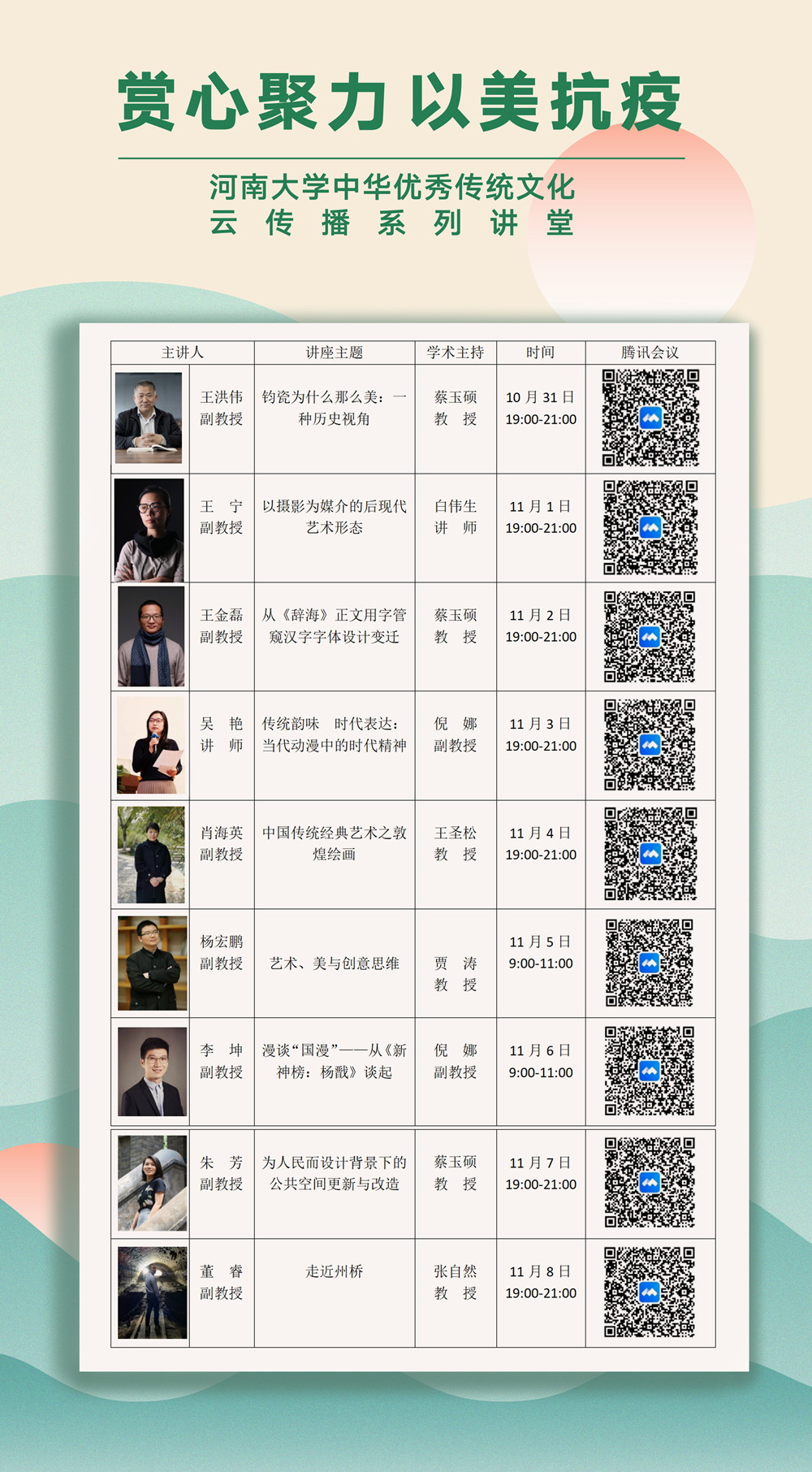 10月29日-11月8日,“赏心聚力、以美抗疫——ac米兰官网中文网站中华优秀传统文化云传播系列讲堂”开讲啦!十位ac米兰官网中文网站美术学院的老师与“你”相约云端,意会古今,温馨畅神。让我们静下心来,共同开启一场中华优秀传统文化的大美之旅;让我们一起努力,弘扬中华优秀传统文化,铸就社会主义文化新辉煌!