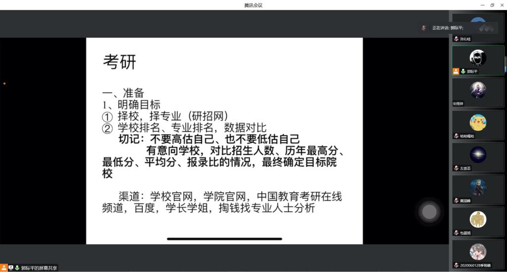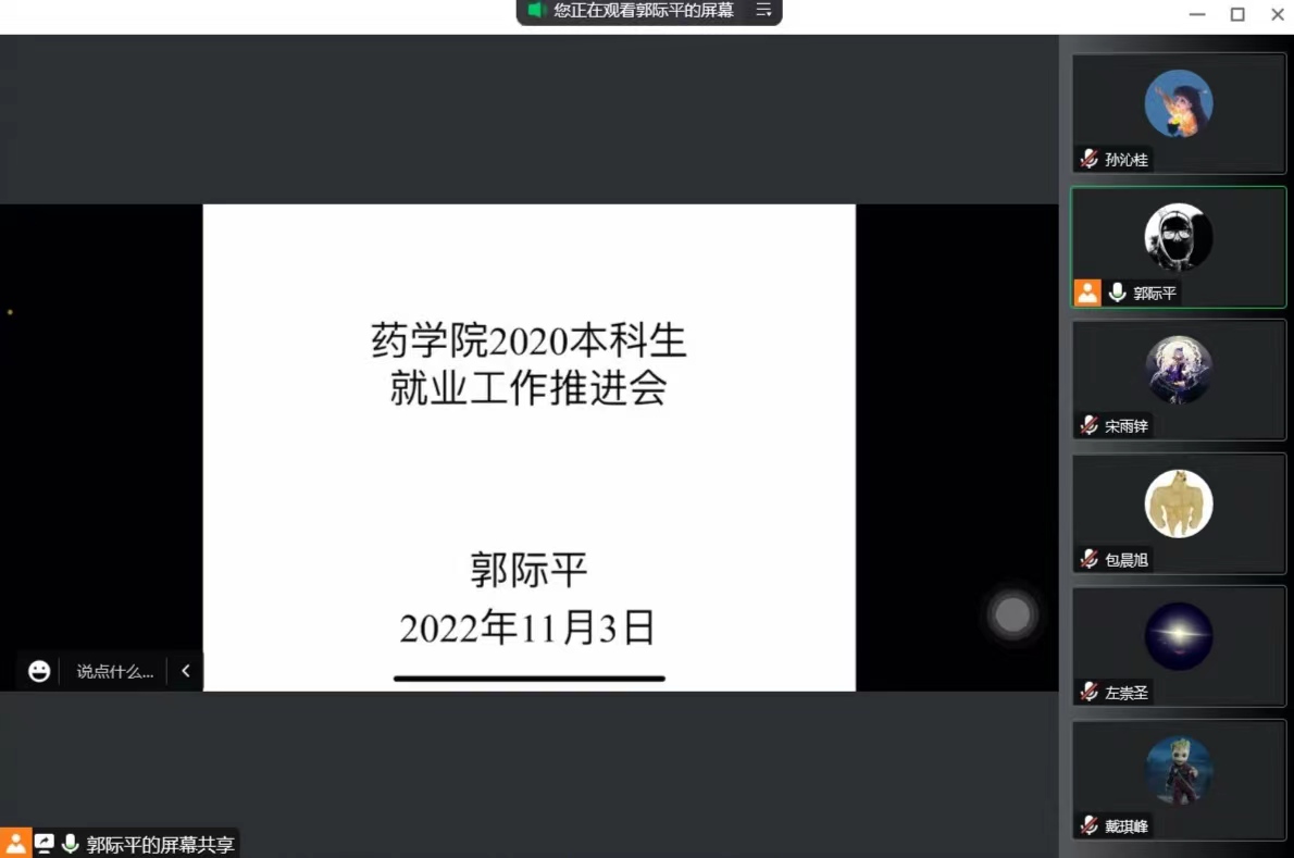 为精准指导2020级本科生考研就业工作,11月3日晚,药学院2020级本科生召开考研就业工作线上推进会。学院党委办公室主任、2020级本科生辅导员郭际平主持会议,全体2020级本科生参加。